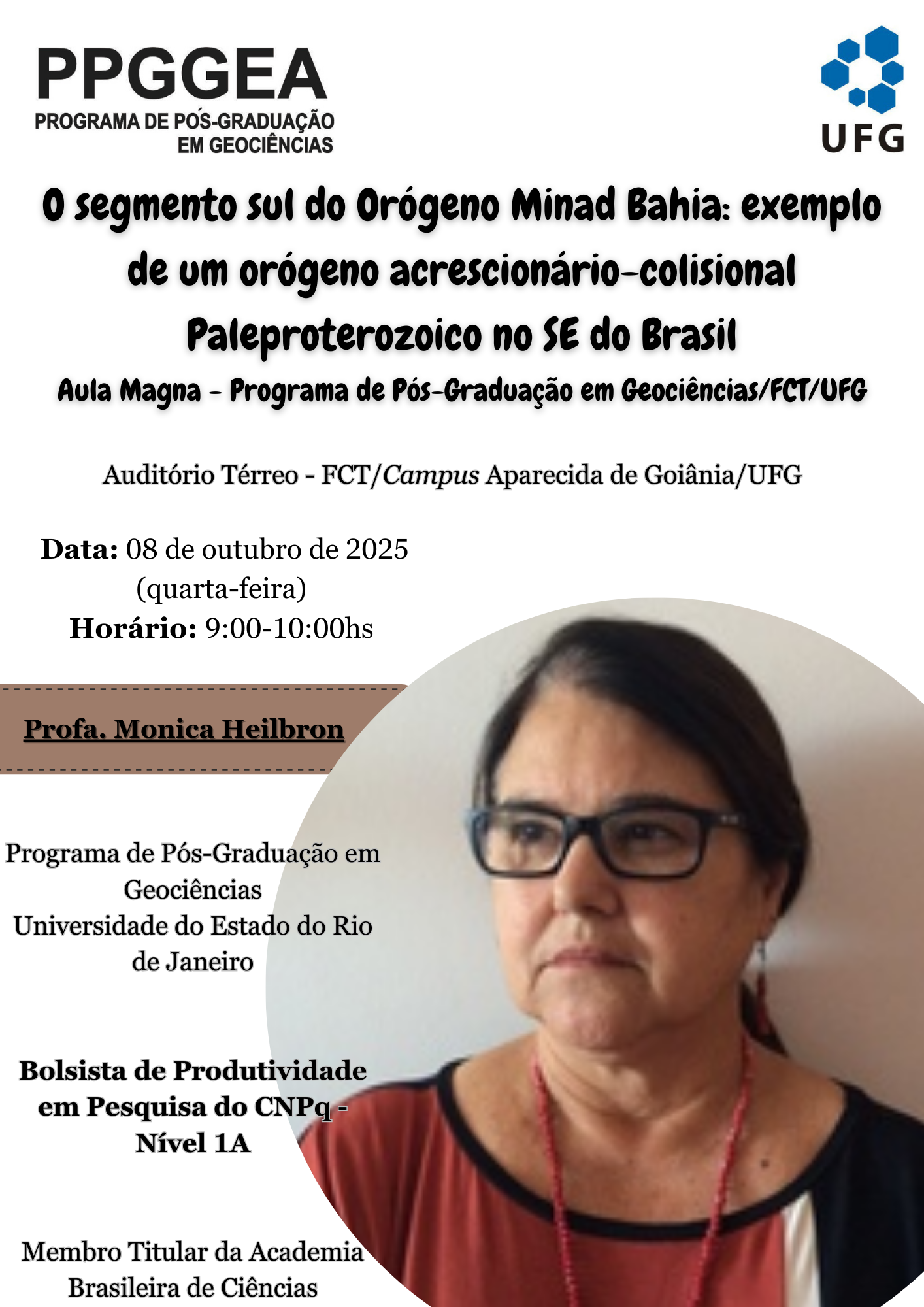 No dia 08 de outubro de 2025, ocorrerão apresentações dos projetos de Mestrado do Programa de Pós-Graduação em Geociências da FCT/Universidade Federal de Goiás, no auditório térreo da faculdade. Os discentes terão 10 minutos para apresentar seus projetos em desenvolvimento, seguidos por uma interação com os participantes. O evento será iniciado com uma Aula Magna da profa. DSc. Monica Heilbron (UERJ).